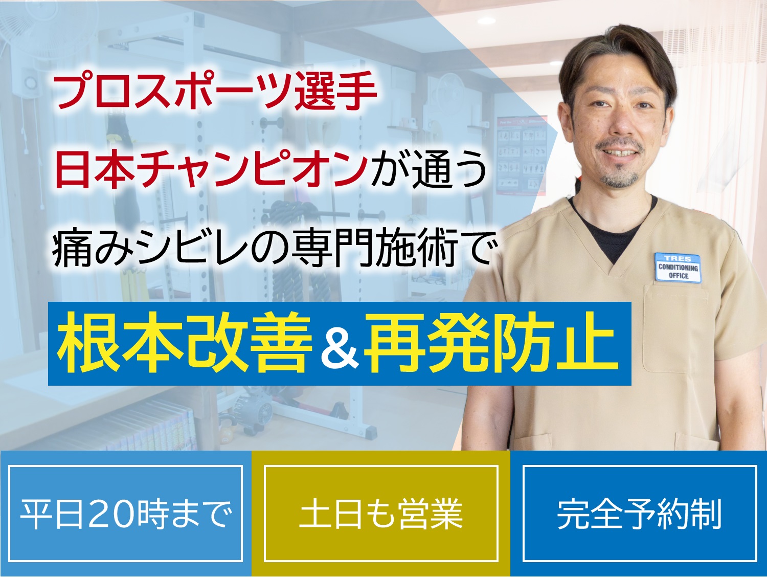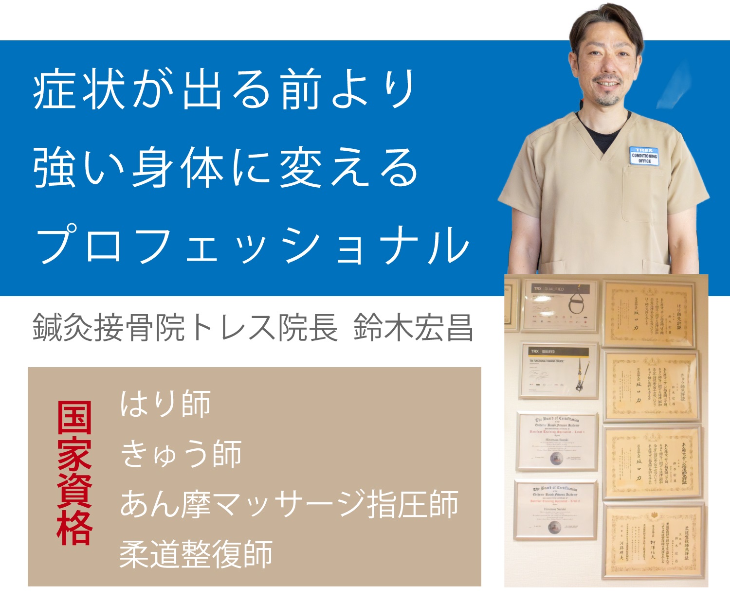 鍼灸接骨院トレスでは、あなたの不調の本当の原因にアプローチして、今ある痛みやシビレを改善させるだけでなく、再発しない身体・痛みが出る前より強い身体に変わっていただけます。