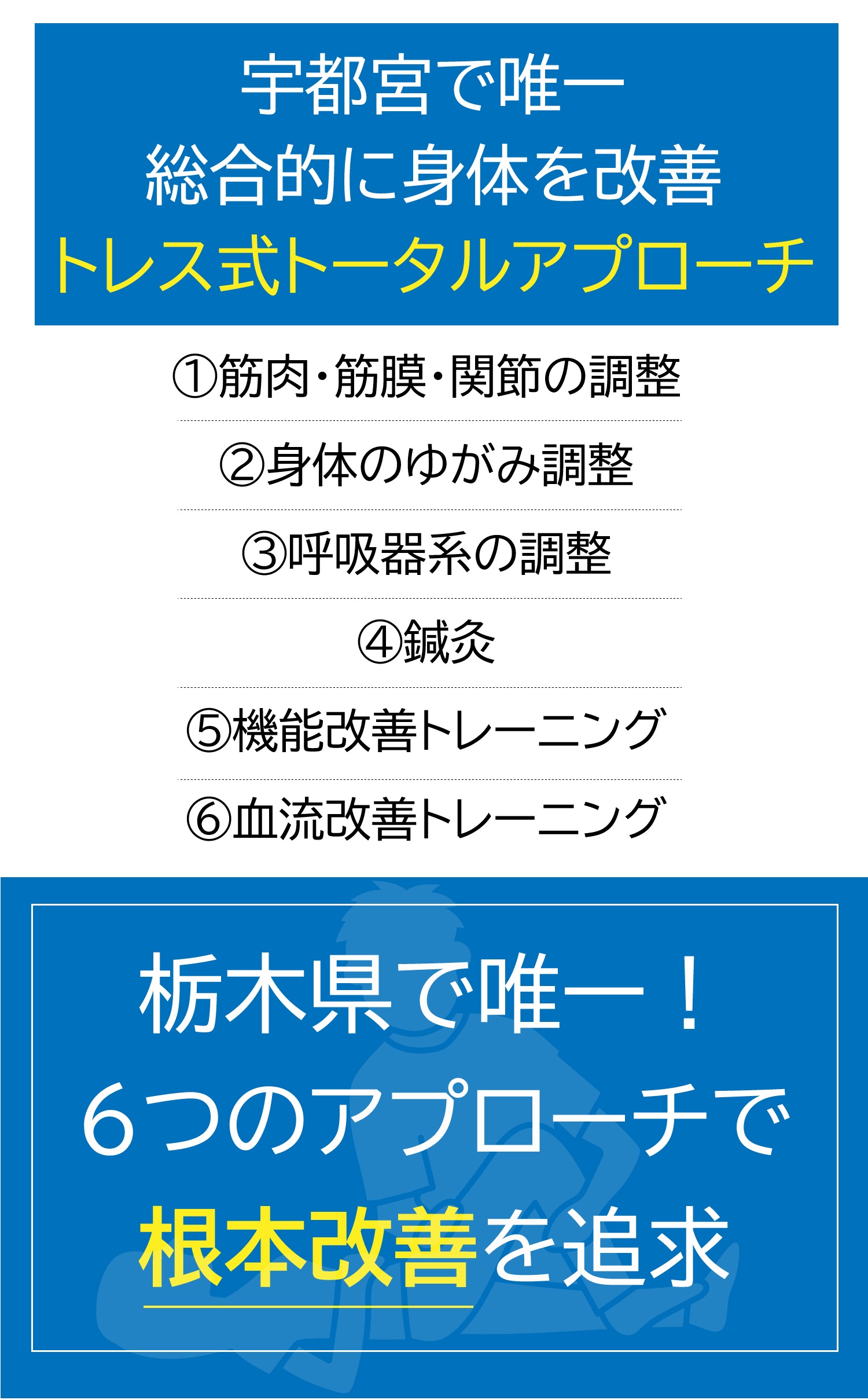 宇都宮市の鍼灸接骨院トレスは、身体の複数の根本原因に同時にアプローチする「トレス式トータルアプローチ」で、多くの重症ヘルニア患者さんの根本改善を実現しています。